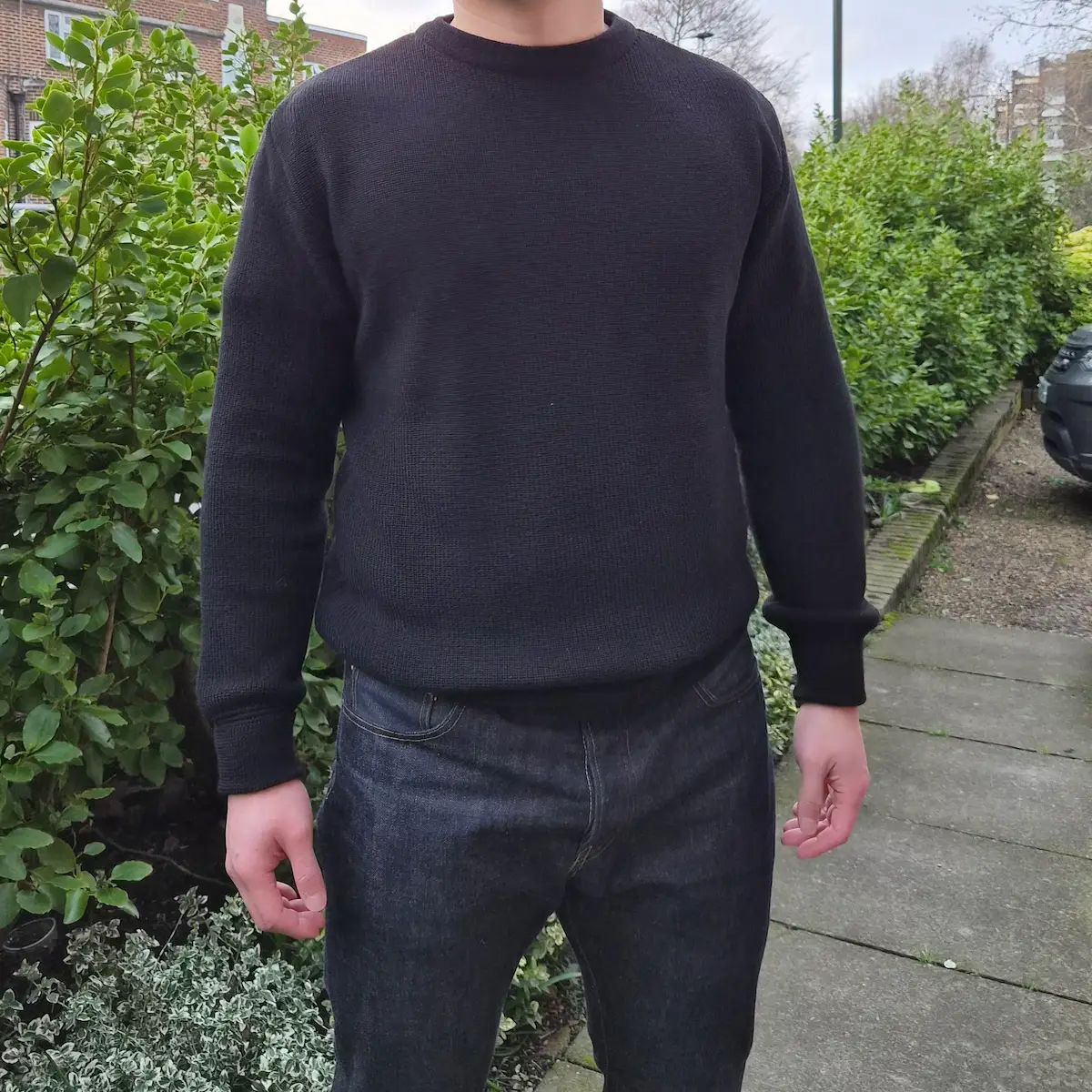 Unlike most modern sweaters, the Rundhals uses 100% virgin Merino wool and a 5-gauge knit construction, giving it a dense structure and noticeable weight.